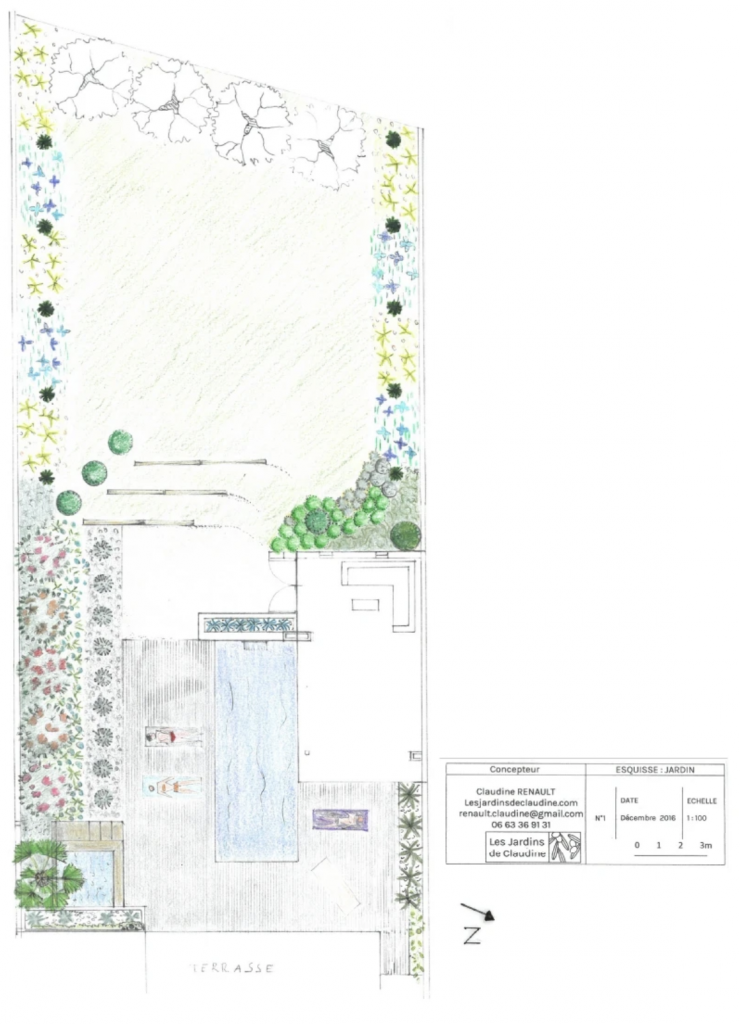 L’espace doit accueillir un aménagement aux lignes plutôt contemporaines incluant piscine, spa et pool-horse au plus près de la terrasse existante.