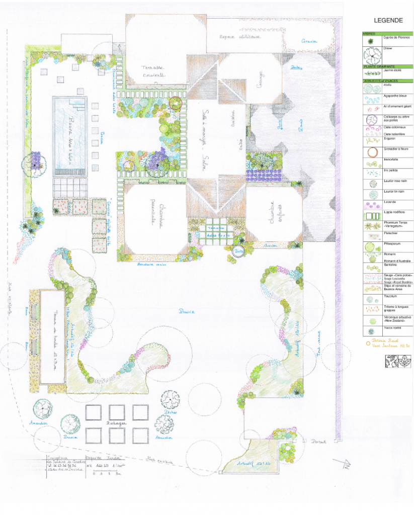 Après plusieurs jets d’esquisse, le choix s’est porté sur un jardin qui se pose sous la forme d’un patio intérieur pour la partie Sud. Patio visible de tous les espaces de vie intérieurs grâce à la présence de nombreuses fenêtres meurtrières et une forme en U du bâti. Il permet l’accès et la vue sur l’espace piscine qui vient s’adosser sur la limite Sud du jardin.